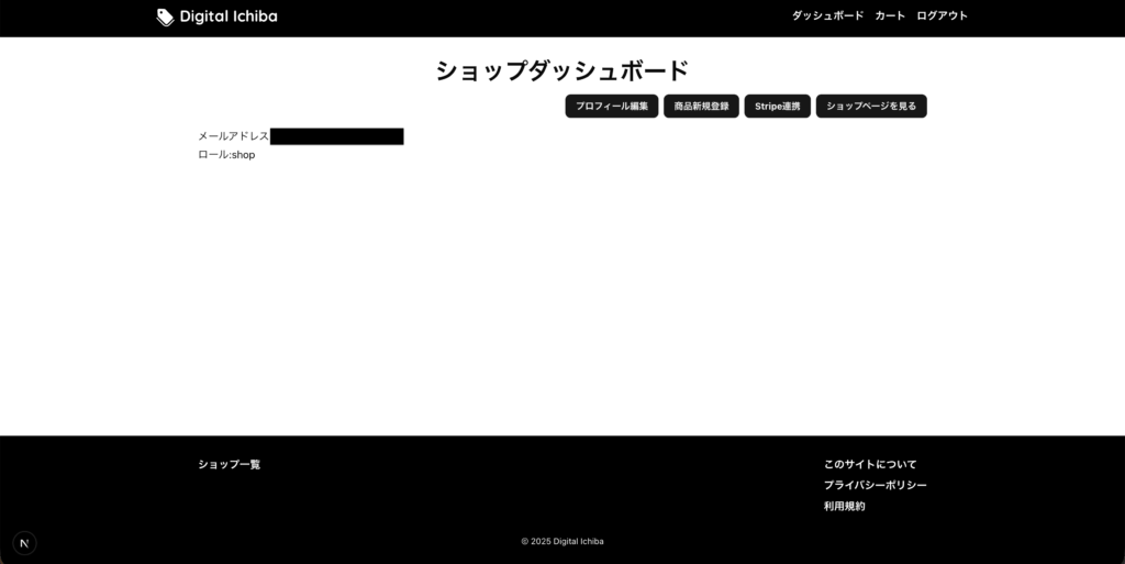 プロフィール編集、新規商品登録、Stripe連結、ショップページを見るのボタンがあります。